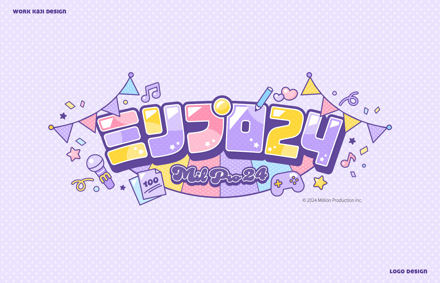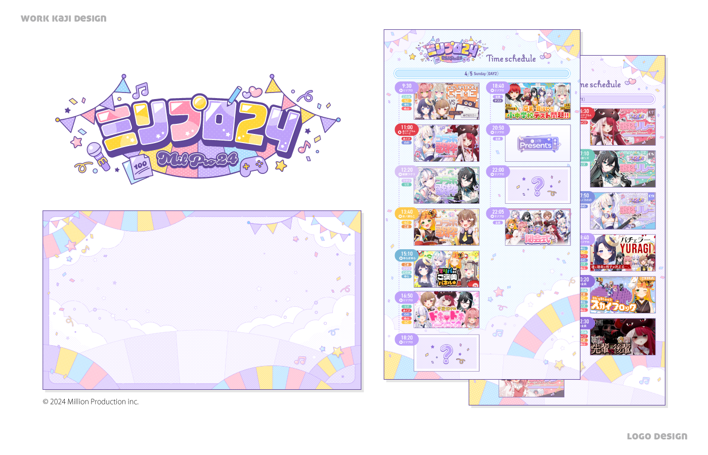 イベントロゴ、スライドデザイン、タイムスケジュール©Million Production inc.2026.4.ミリプロカラーを基調に、お祭りのような賑やかな雰囲気に仕上げています。全体で統一感のある印象になるよう、トーンを揃えてデザインしました。