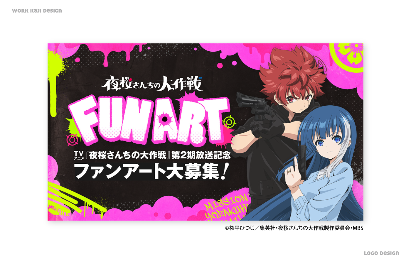 TVアニメ『夜桜さんちの大作戦』第2期SNSキャンペーン告知ビジュアル©権平ひつじ/集英社・夜桜さんちの大作戦製作委員会・MBSファンアート募集のために、ペンキを散りばめて自由に描き込めるストリート風に仕上げ、銃痕や標的マークでスパイのクールな印象もプラスしました